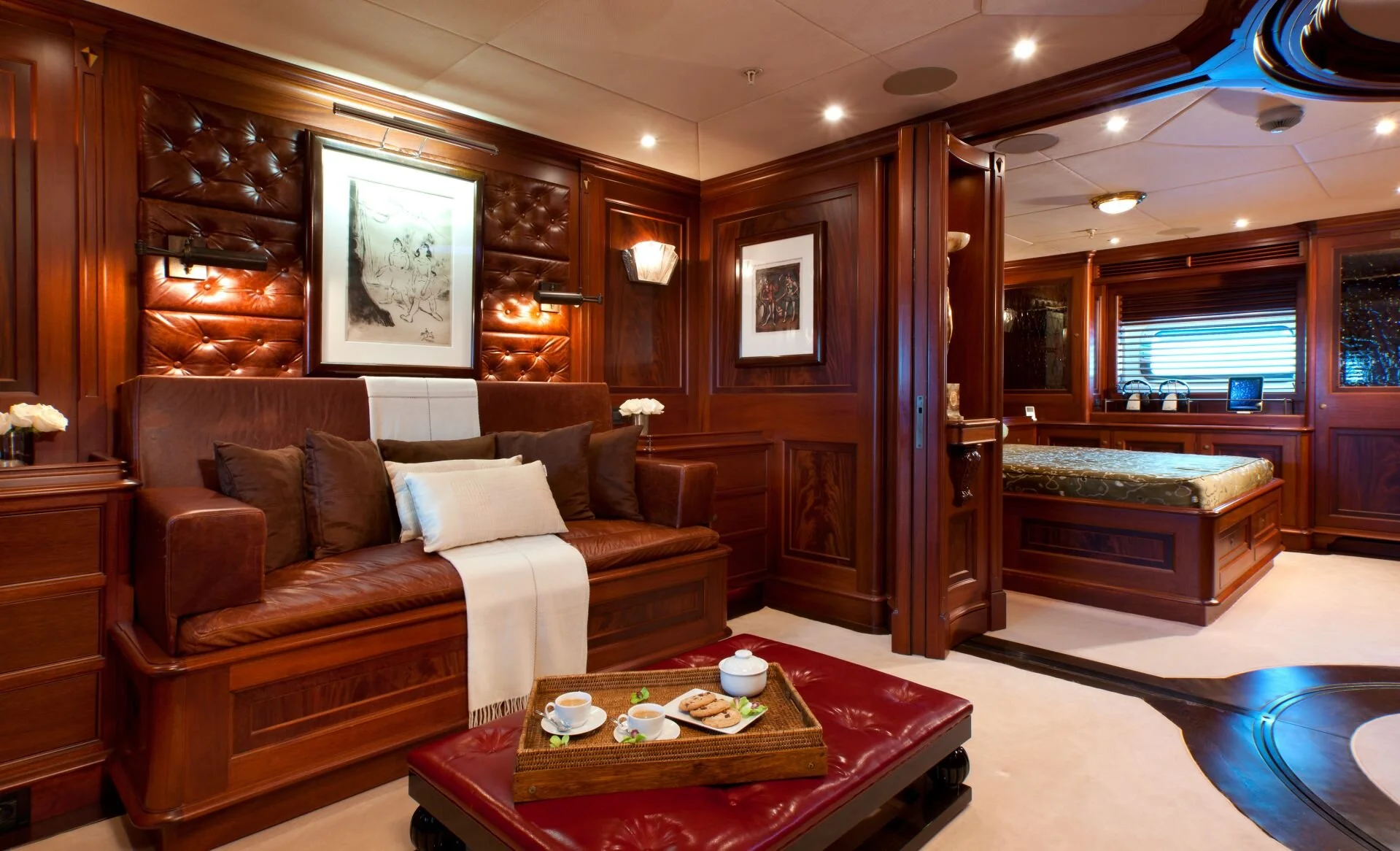 The interior of Tiara was completed by award-winning yacht designer, John Munford, who created a space that is elegant, traditional, and grand. The yacht features genuine 1930’s Art Deco-style detailing throughout, including flamed mahogany, leather, and lacquer.